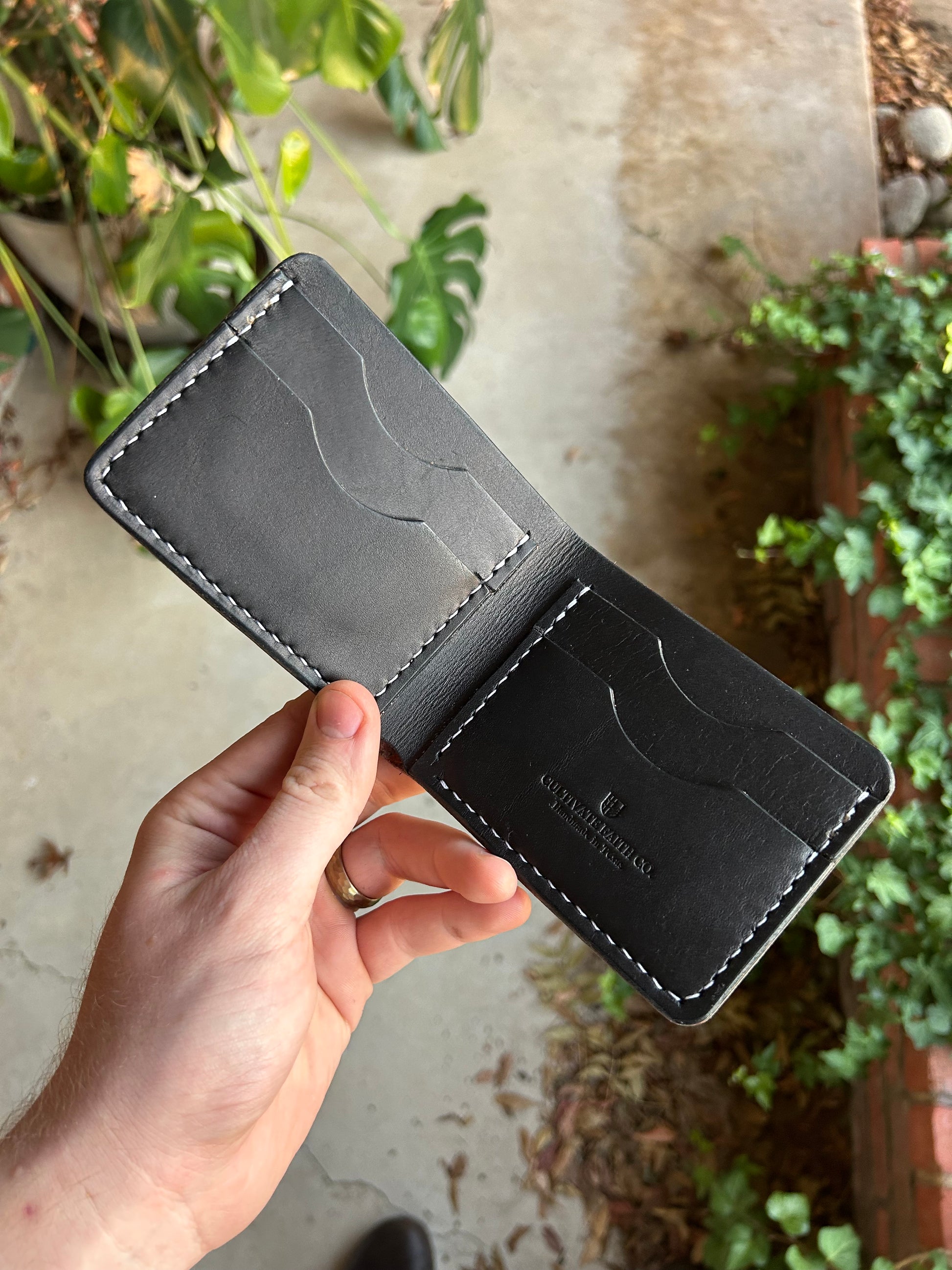 This wallet is a spacious billfold, comfortably holding 4-8 cards (can hold up to 12 if with stretching) and can carry a large amount of cash. All of our leather wallets are hand cut, stitched, and burnished!
